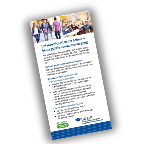Schülerinnen und Schüler stehen unter dem Schutz der gesetzlichen Unfallversicherung. Das heißt: Wir von der Unfallkasse Rheinland-Pfalz sind immer dann zur Stelle, wenn ein Kind in der Schule oder auf dem Weg dorthin bzw. zurück nach Hause einen Unfall erleidet.
