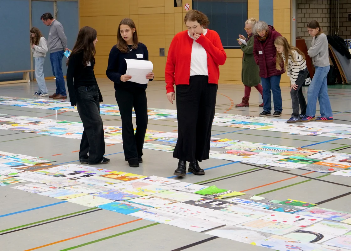 Die Jury, bestehend aus Georg Ehrmann vom Ministerium für Bildung Rheinland-Pfalz sowie den Lehrkräften Bernd Kammer, Helen Lauer, Cornelia Plath, Steven Rühle und Christian Hacker, wird ergänzt durch Schülerinnen und Schüler der IGS Pellenz. Gemeinsam durchstreifen sie die Halle, scannen die Bilder und diskutieren auf Augenhöhe. „Ich lasse mich von den Schülerjurorinnen und -juroren gerne leiten“, erzählt Cornelia Plath. Das Verhältnis ist demokratisch – jede Meinung zählt.